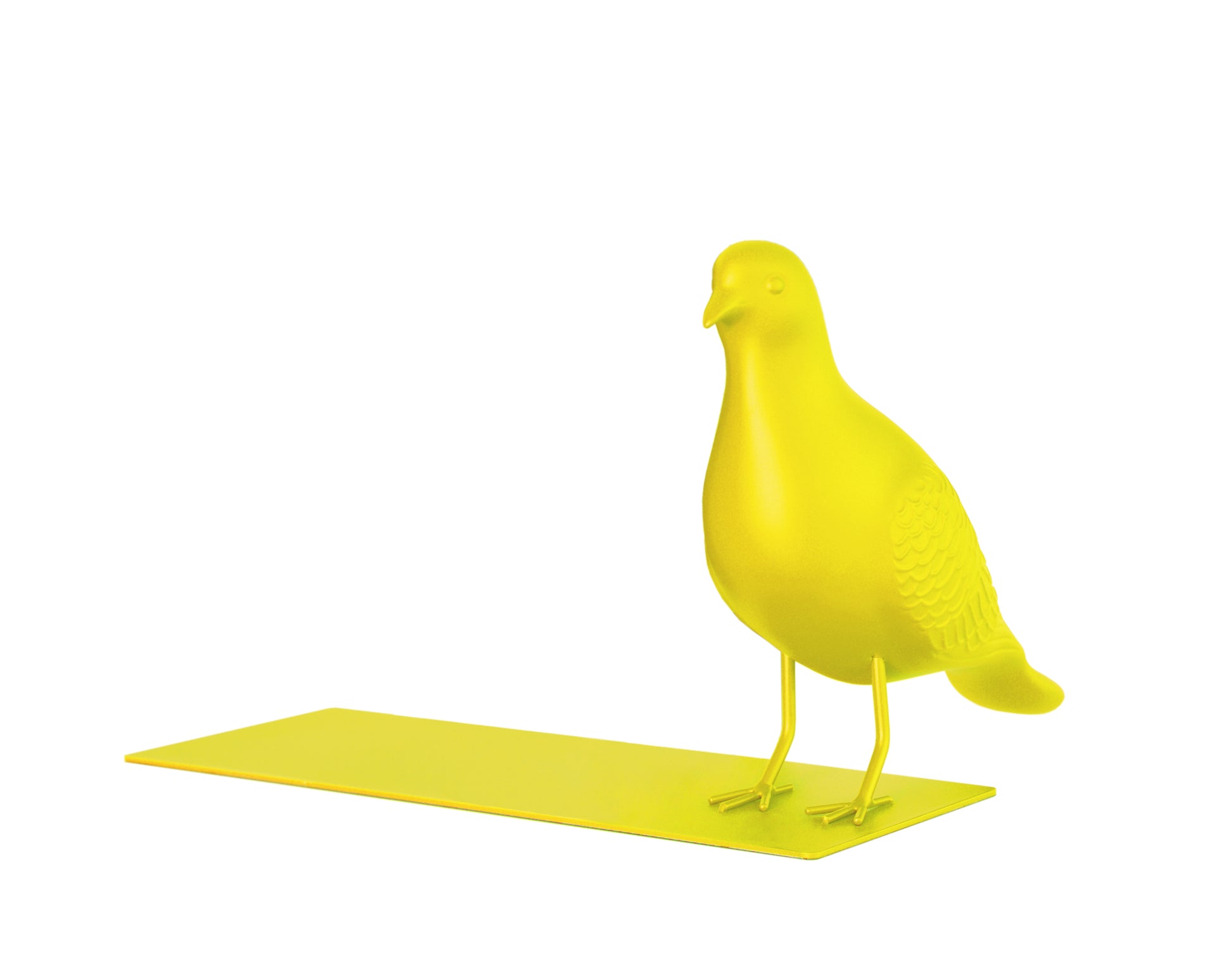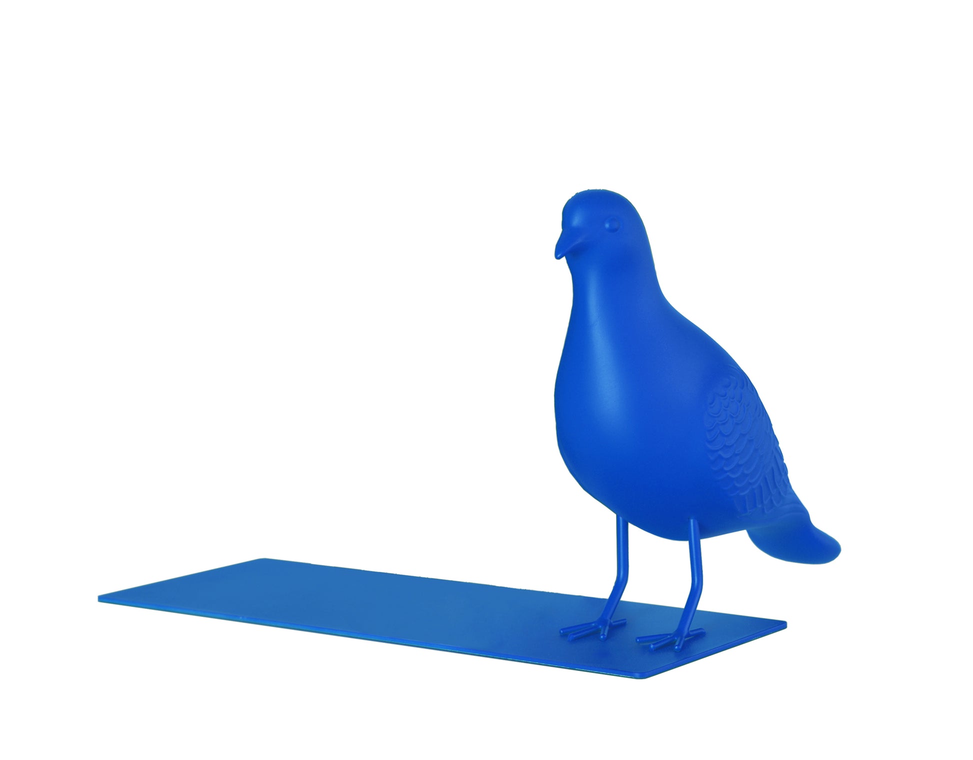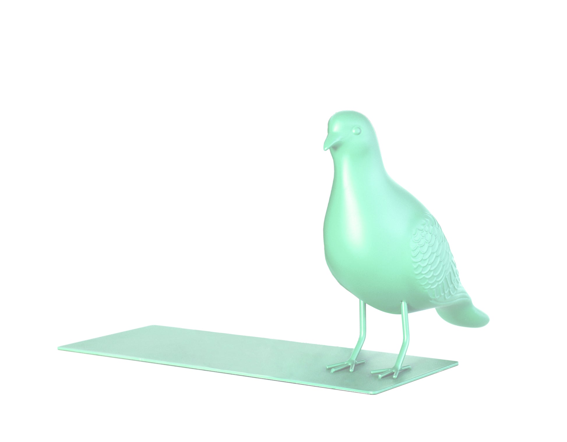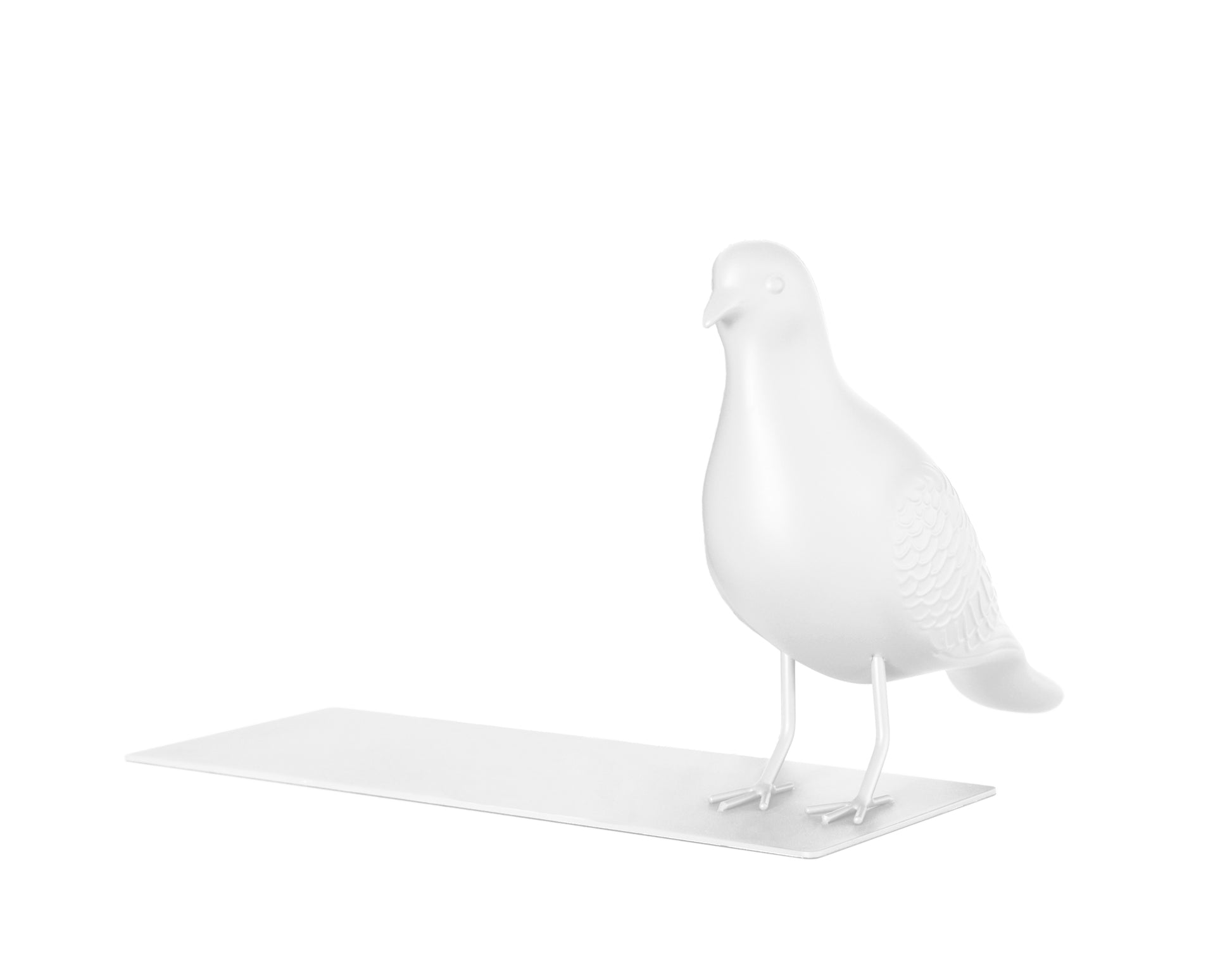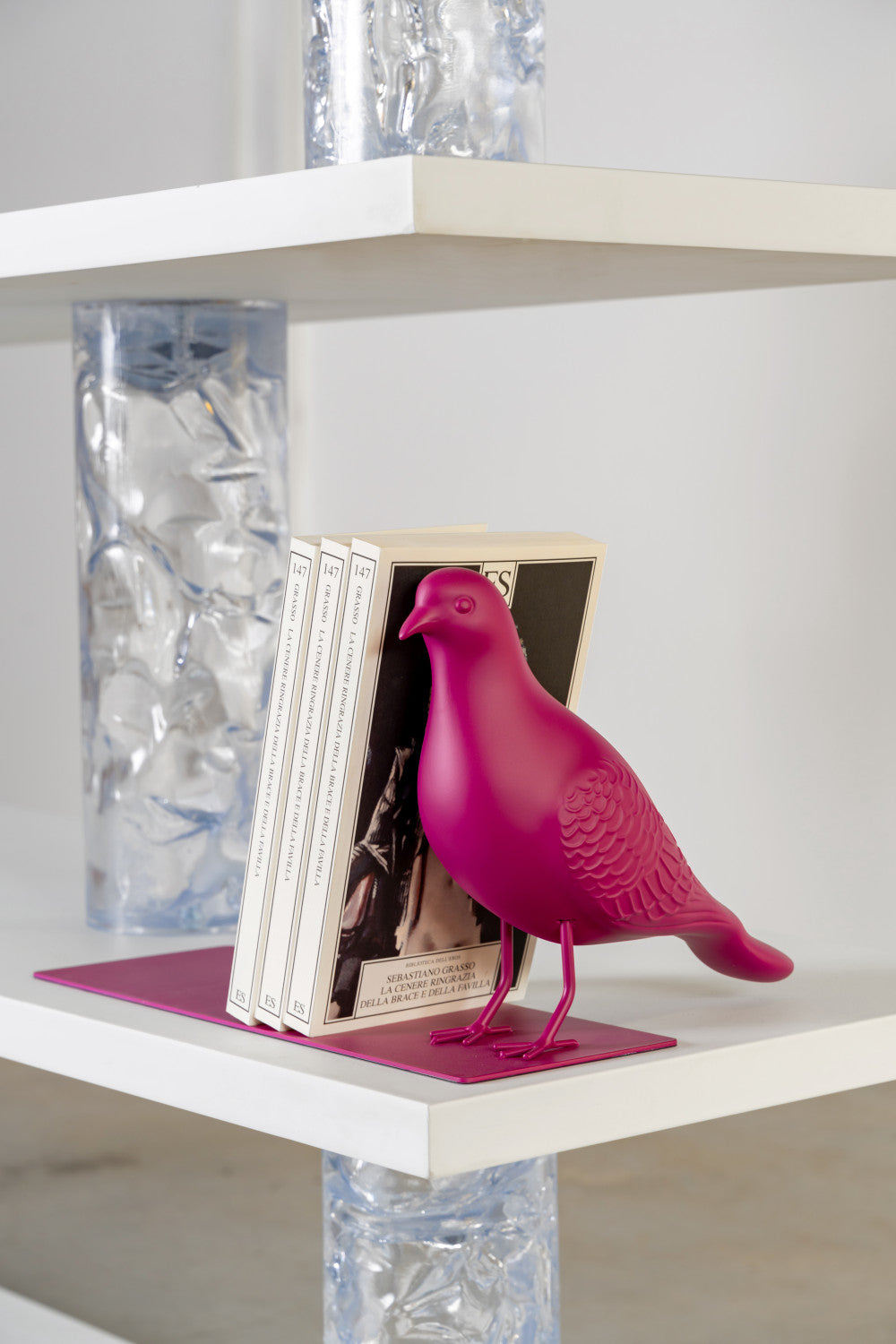 Fun and irreverent accessory, Noncaga is a is a self-standing pigeon-shaped complement made of blown polystyrene psv transparent and matte. Available in different variants, self standing, bookend and as base for other accessories.