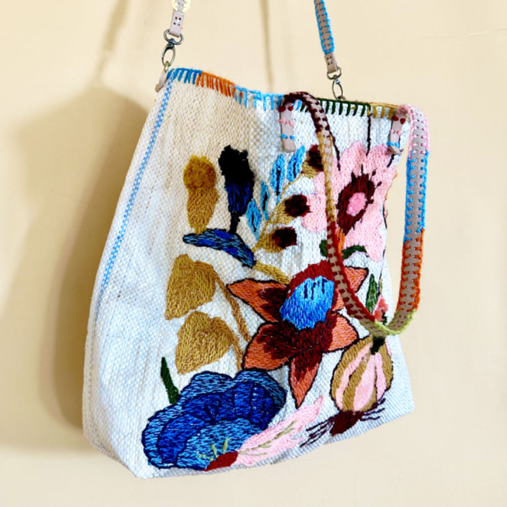 45% plastic, 25% Raffia, 20% polyester, & 10% cow leather.