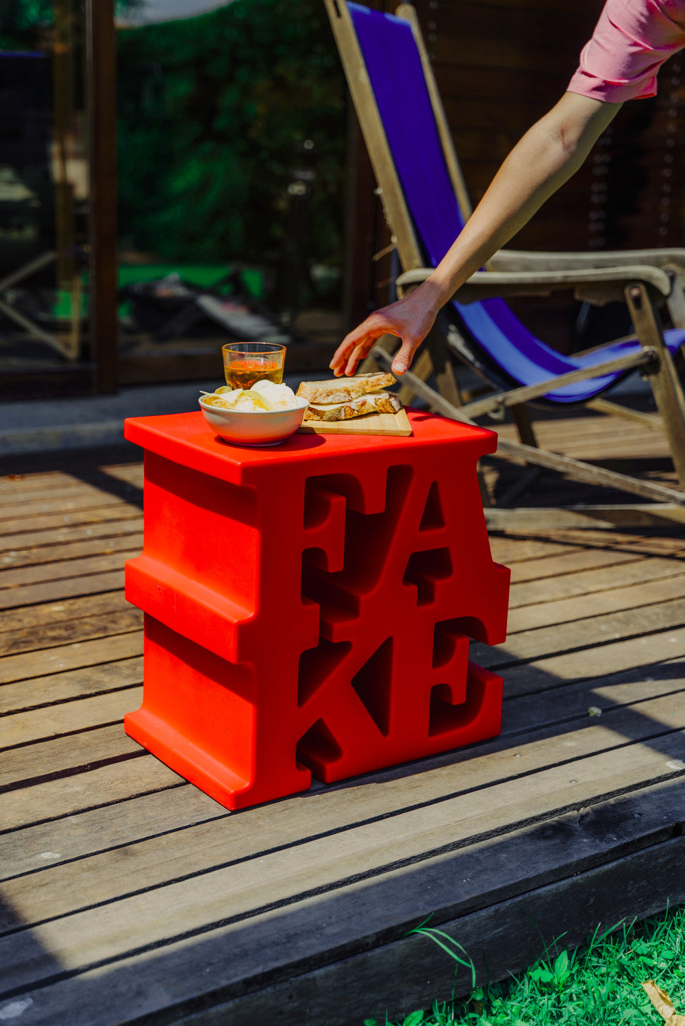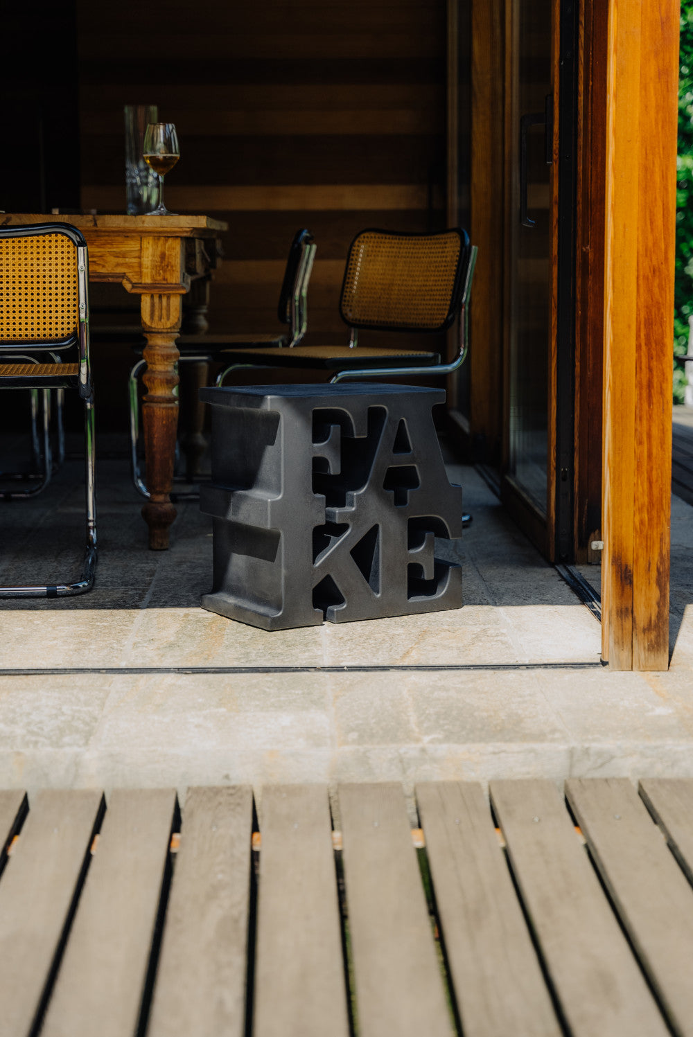 Fake, before being a stool, is the synthesis of the designer/artist’s thought which, in balance between the rules of mass production and the aspiration to the unique product, expresses the values of the sculpture within the realm of pro- duct design. With disarming sincerity, Fake’s epigraphic lettering declares its own fakeness as an art and functional piece, which makes it authentically unique, in contradiction with itself. Uto Balmoral, with innate irony and desire to surprise, walks backwards the path to the re- ady-made: he takes from the art world to con- sacreate his products into the design context, where function assumes at times a purely acci- dental avour.Edit By Anna Cassani